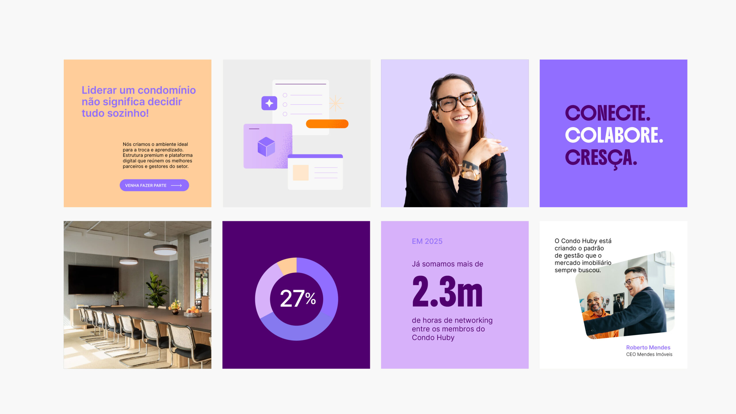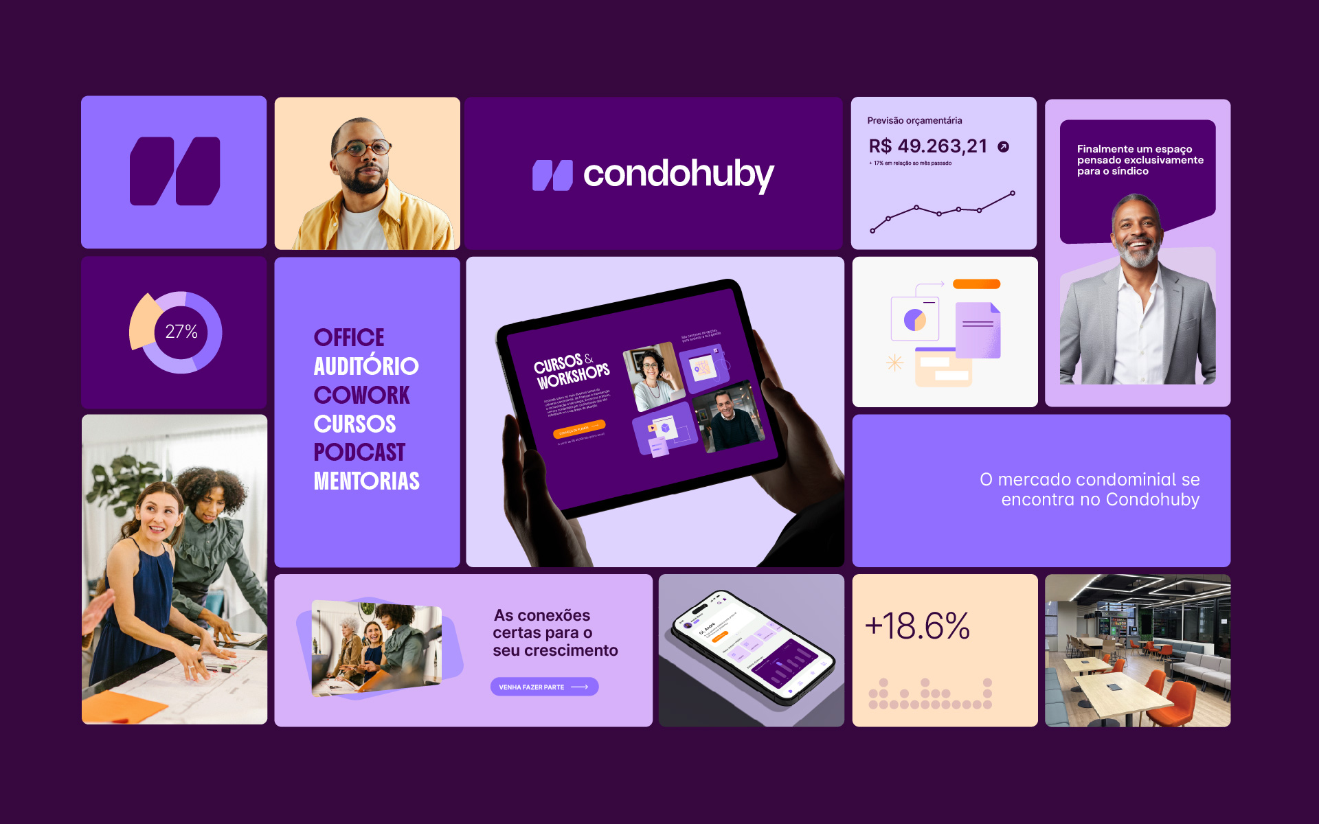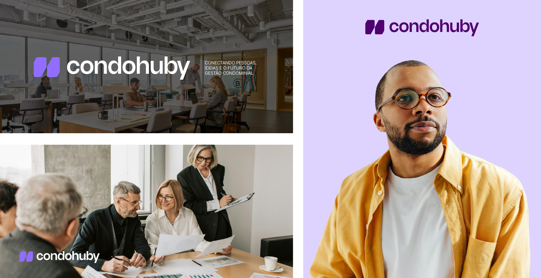 Chegou o momento de ver a nossa identidade ganhar vida. Nesta seção, reunimos aplicações reais que demonstram como todas as diretrizes técnicas apresentadas ao longo do manual se conectam. Observe como a harmonia entre marca, cores, tipografia e imagens constrói uma narrativa visual única, garantindo que o Condohuby se comunique com consistência, clareza e impacto em todos os pontos de contato.