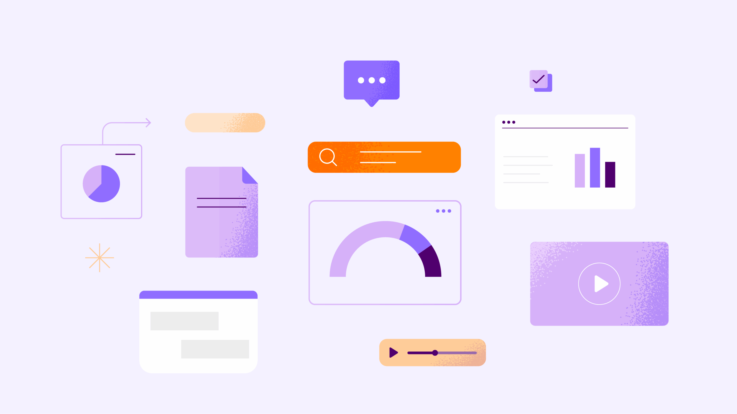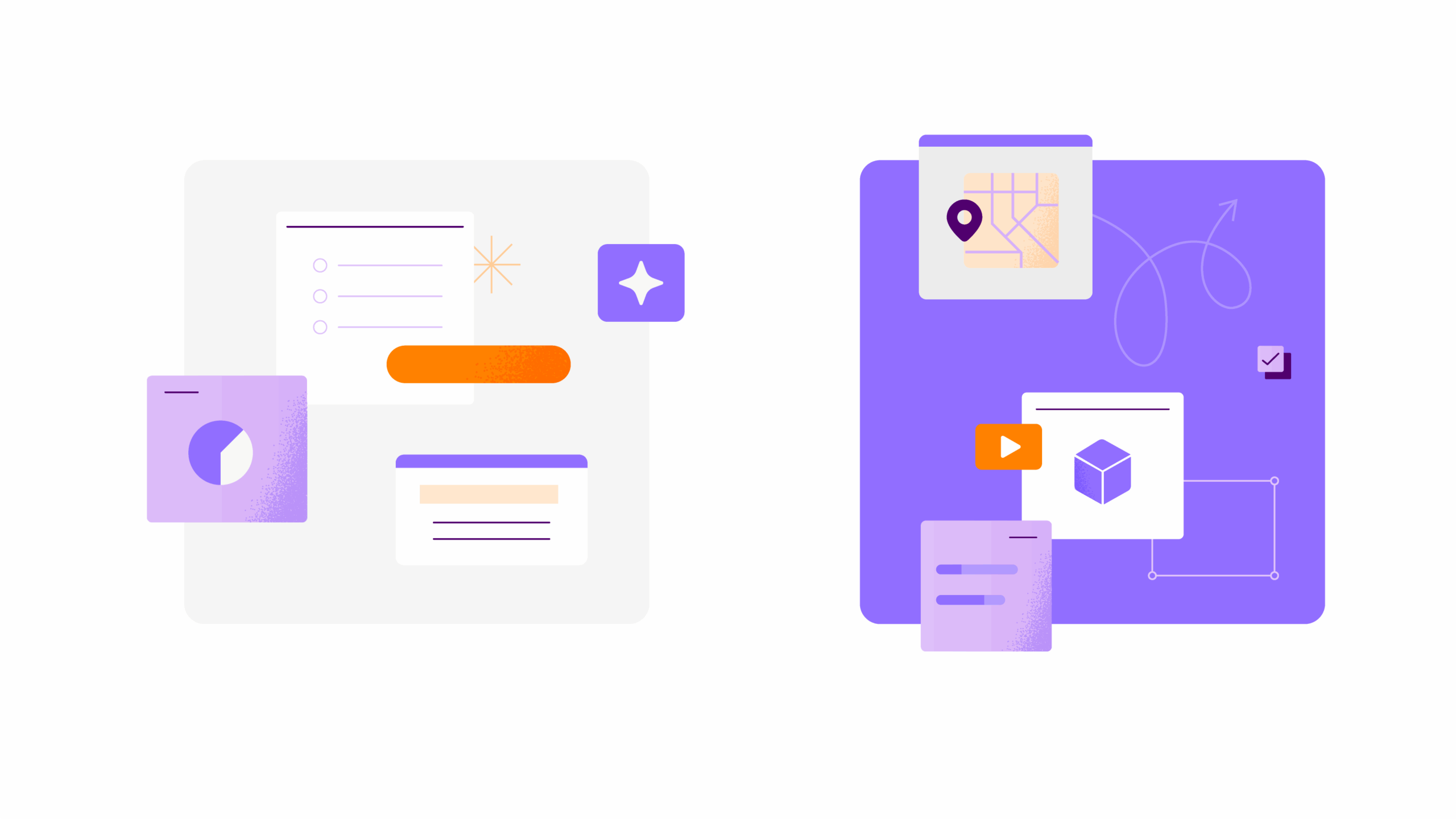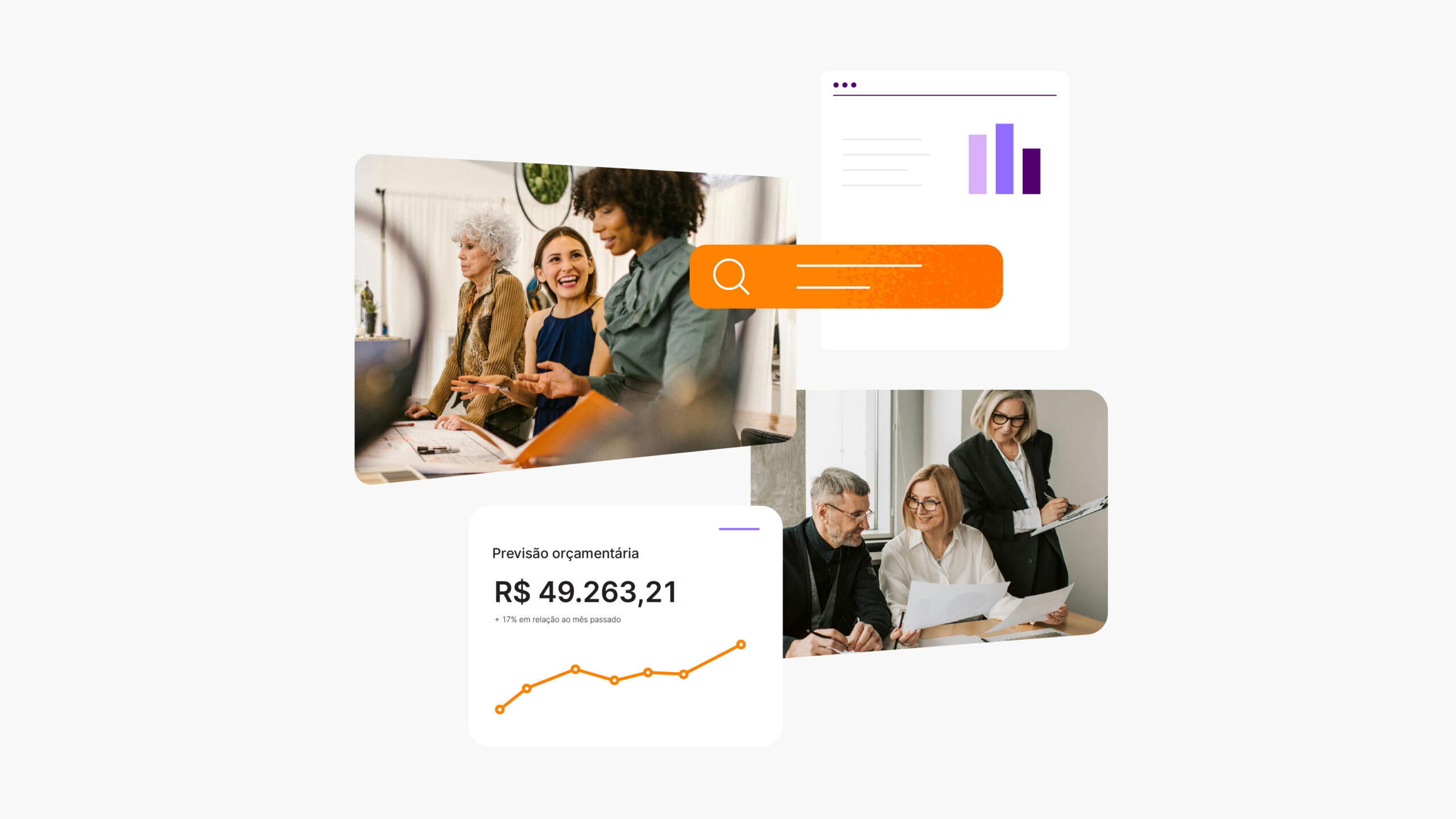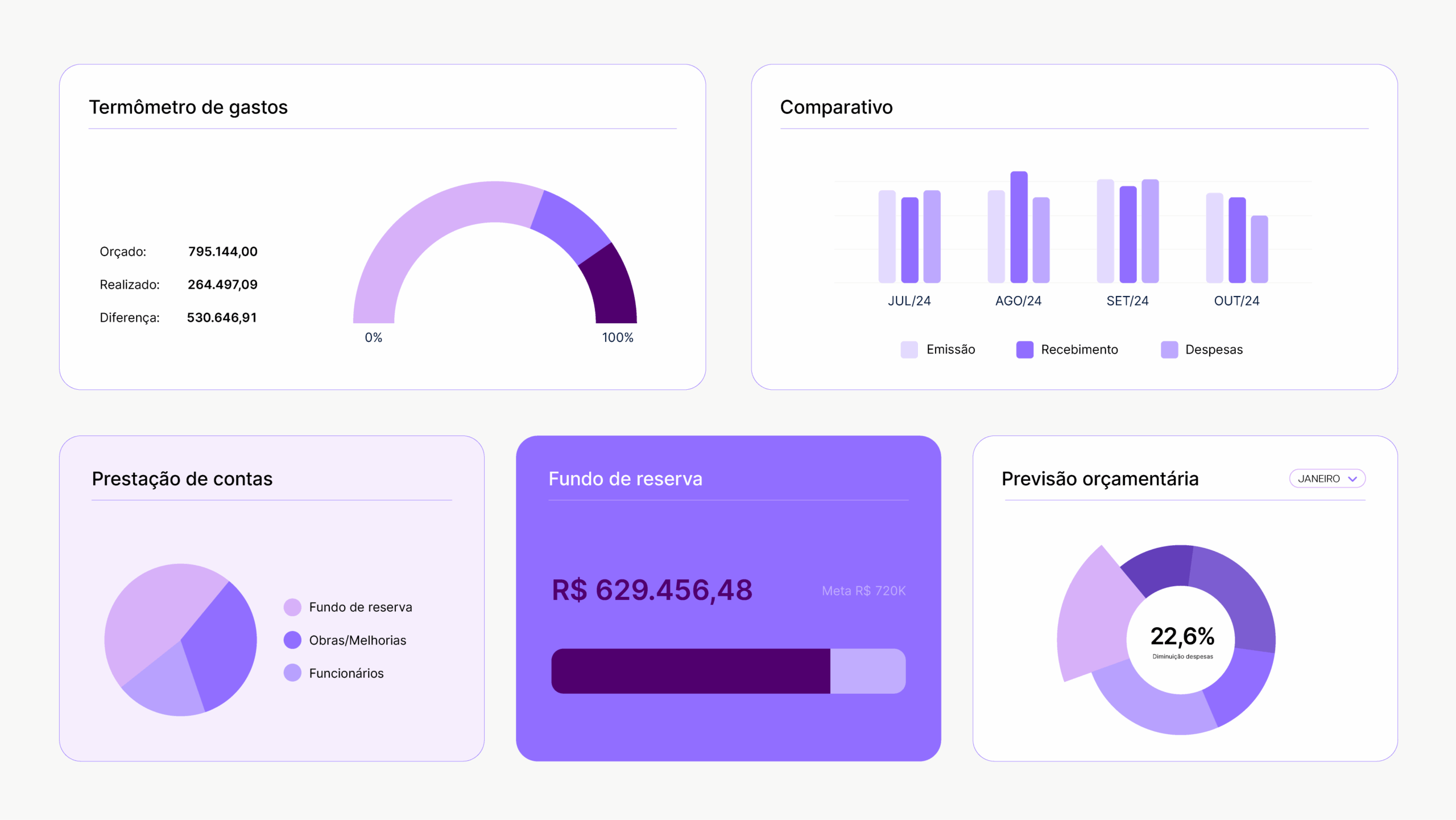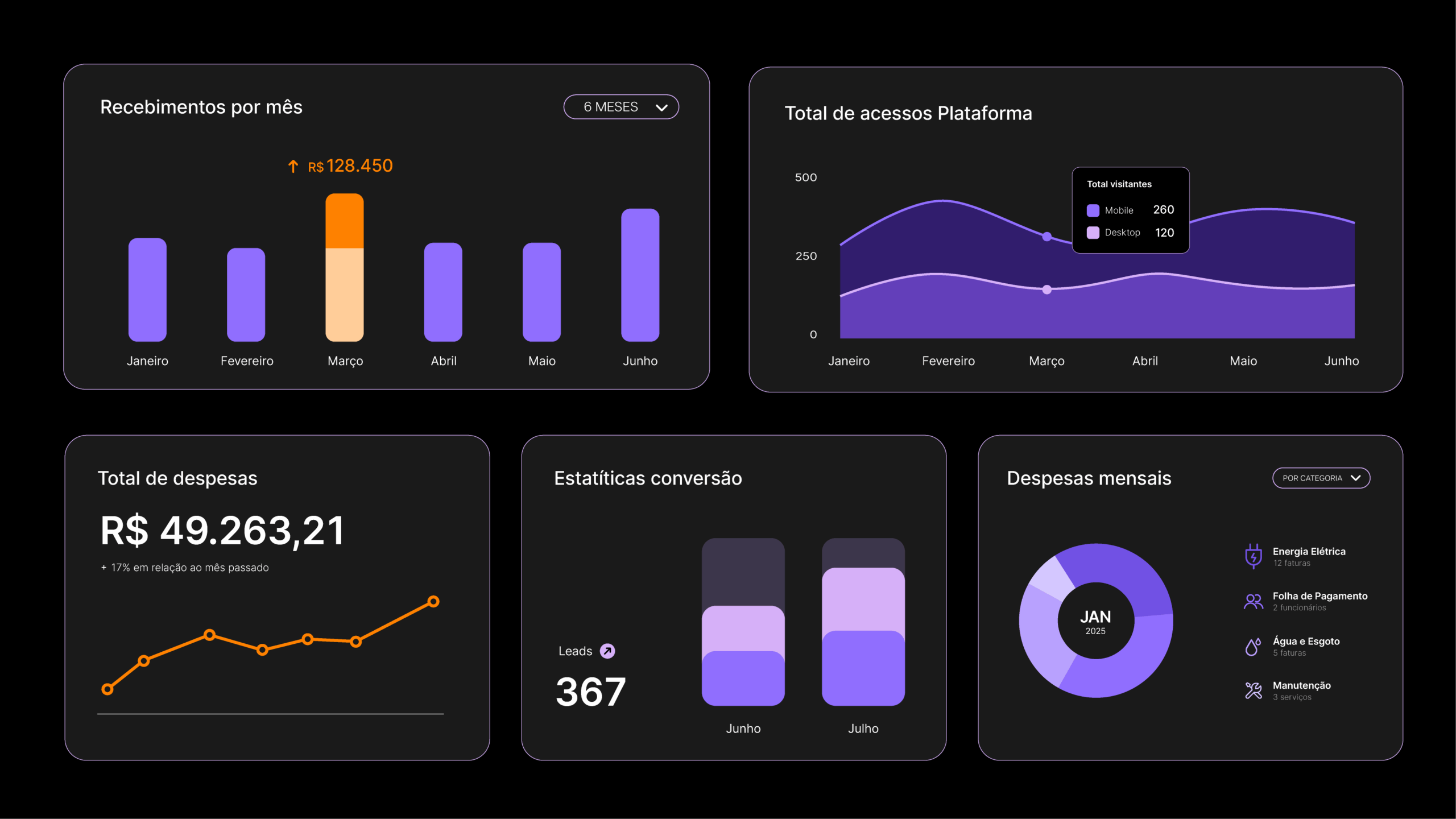 Nossa biblioteca de gráficos, produzida para ser utilizada em interfaces e ferramentas digitais, traz clareza e assertividade para informações complexas. Utilizamos diferentes tons de roxo para criar diferentes níveis de leitura nas informações, e os tons de laranja para criar contraste e destaque. Os gráficos incluem as versões de fundo escuro e variações mais ilustrativas para o uso em sites e relatórios.
