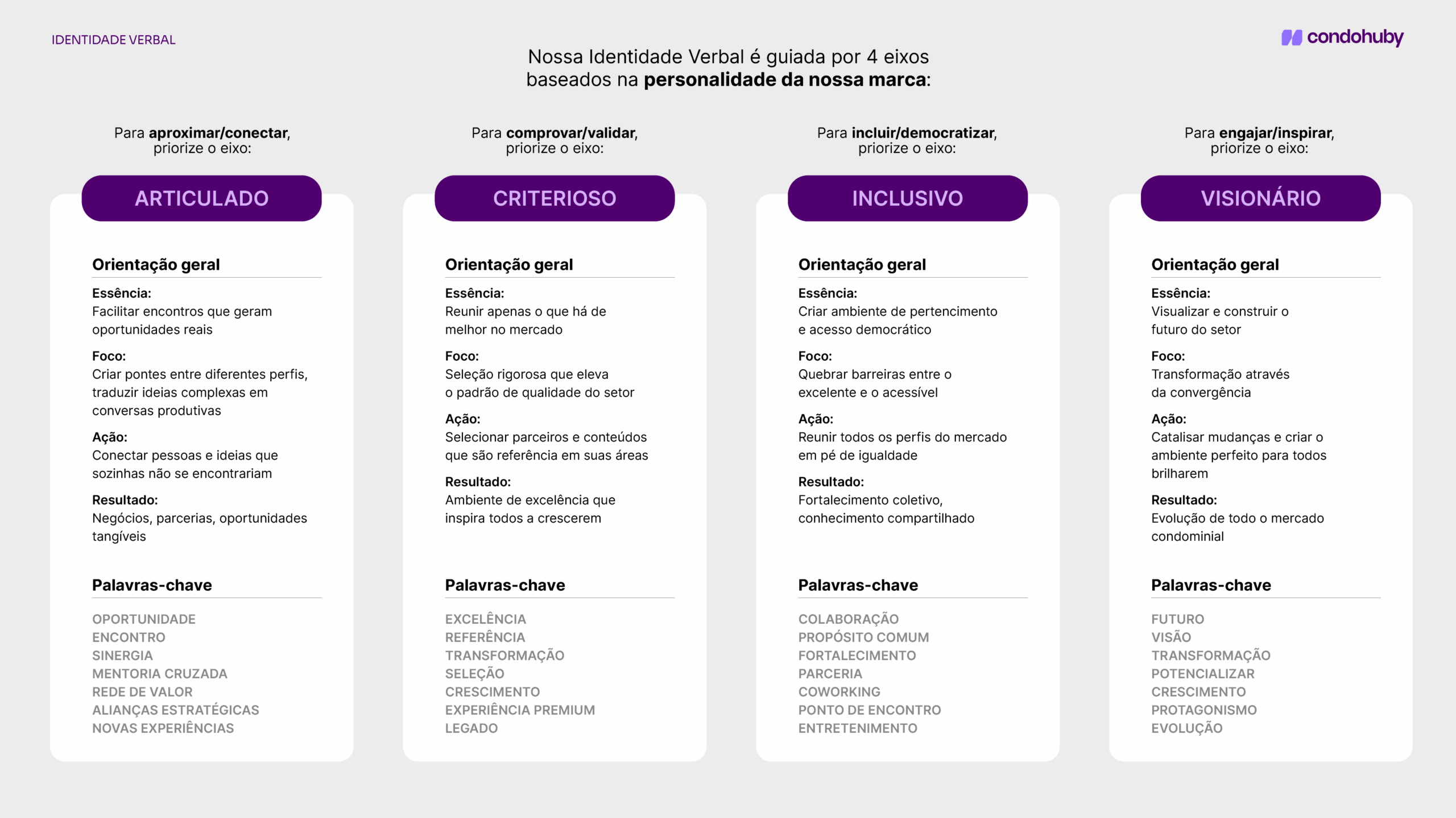 A Identidade Verbal é o alicerce da nossa comunicação. Ela é a manifestação da nossa personalidade, a “Voz” única e consistente do Condohuby.