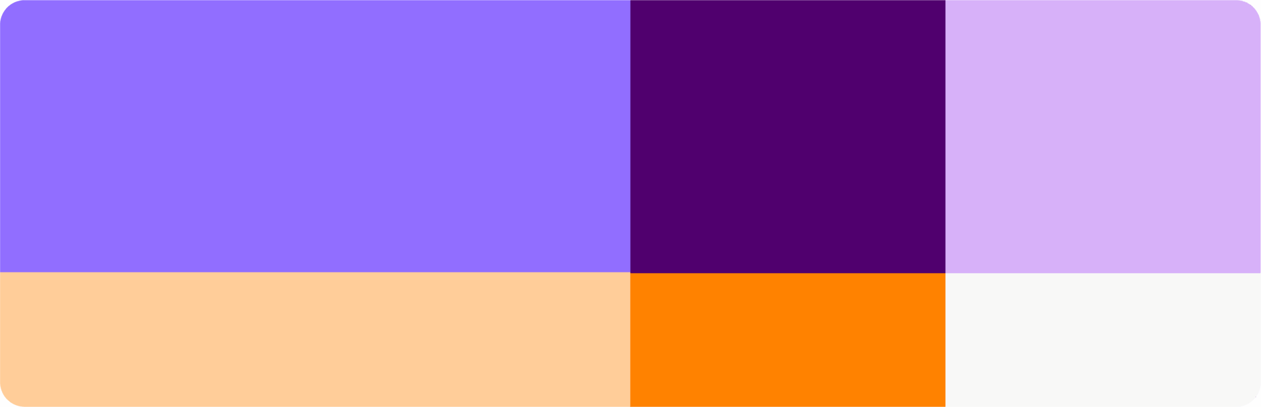 A cor é uma das principais expressões da nossa identidade. Nossa paleta principal é composta por diferentes tons da cor roxa, acompanhada de tons de apoio na cor laranja e cinza. O preto também pode ser utilizado em textos que precisem de contraste absoluto com o fundo.