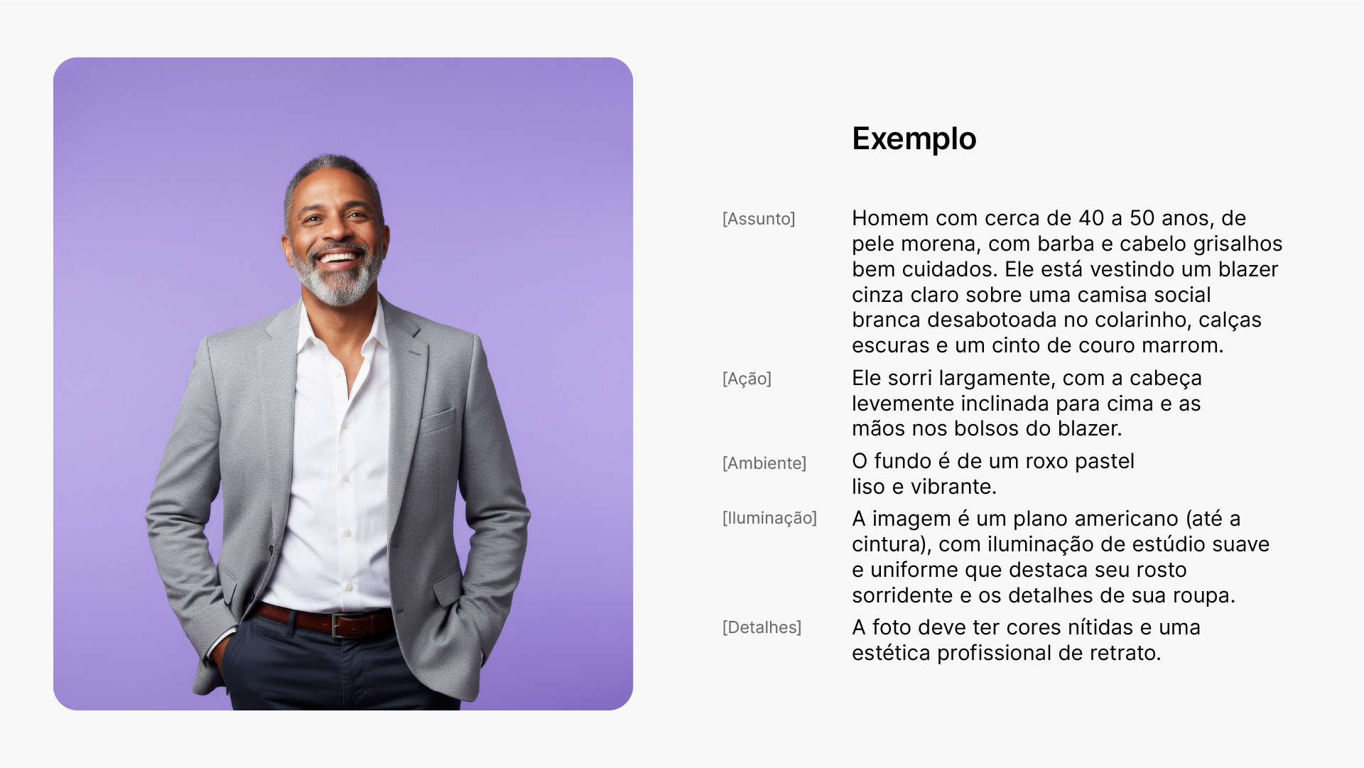 [Assunto] + [Ação] + [Ambiente] + [Iluminação] + [Detalhes]