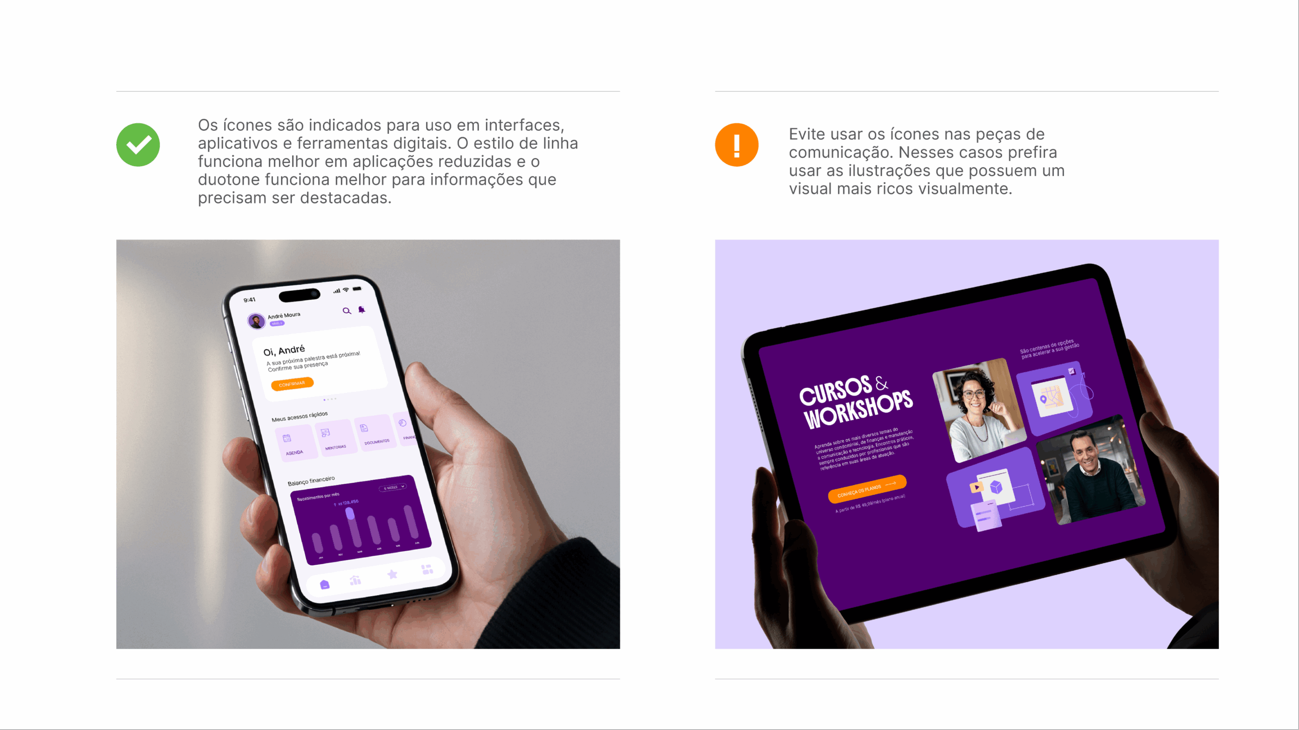 Os ícones são indicados para uso exclusivo em interfaces, aplicativos e ferramentas digitais. O estilo de linha funciona melhor em aplicações reduzidas e o estilo duotone funciona melhor para informações que precisam ser destacadas. Evite usar os ícones nas peças de comunicação. Nesses casos prefira usar as ilustrações que possuem mais riqueza visual.