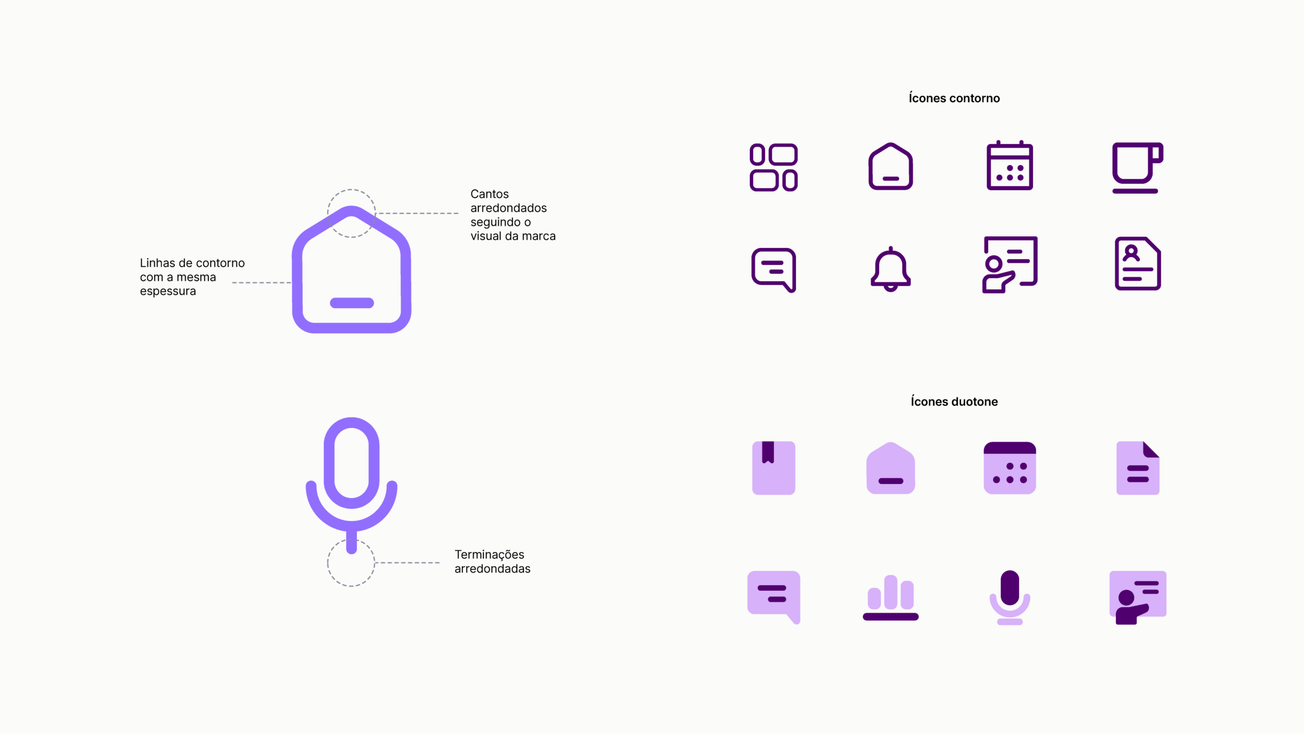 Para o estilo de linha use como referência a biblioteca Material icons do Google ou da Lucide.dev. Para o estilo duotone use como referência a biblioteca Core flat do Streamline.
