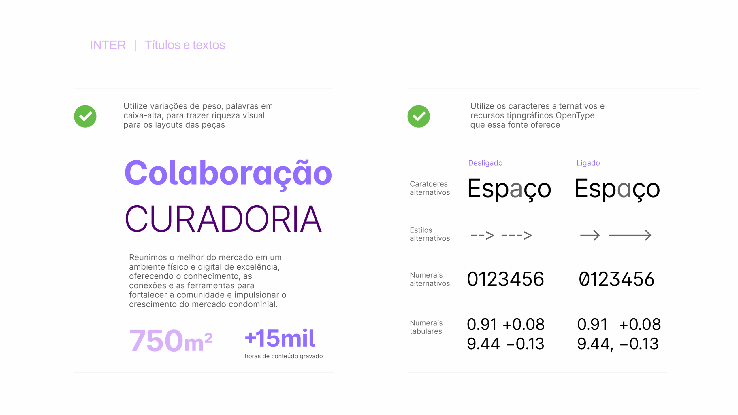 A Inter é uma fonte ideal para uso em interfaces. Com seu aspecto corporativo e muito versátil é a fonte que usamos para compor títulos e toda a variedade de textos.
